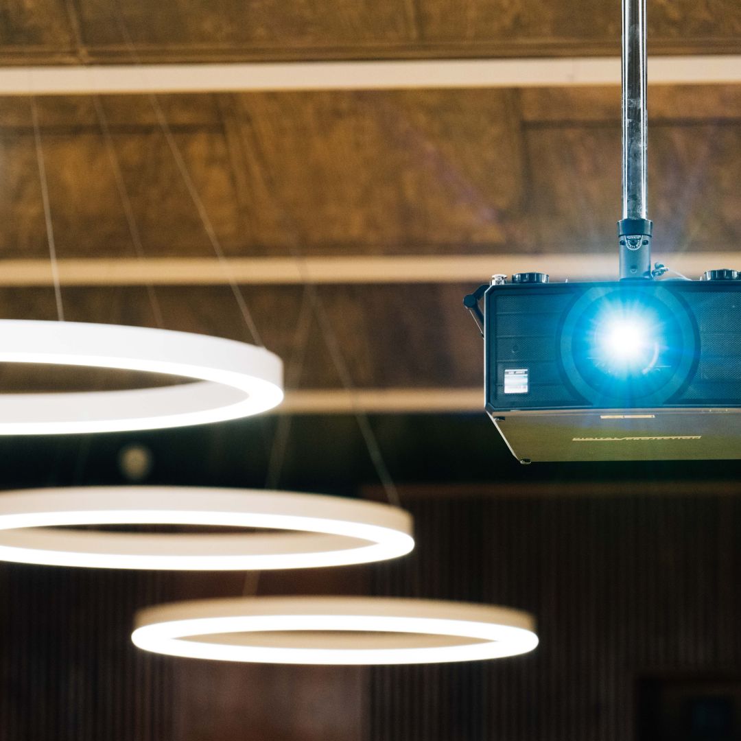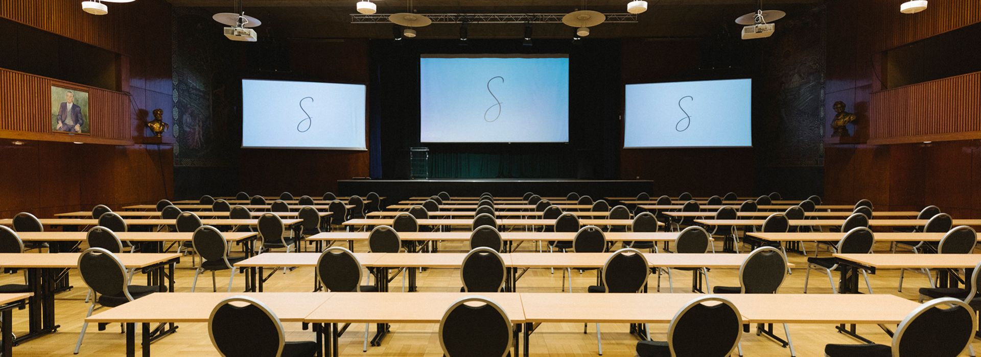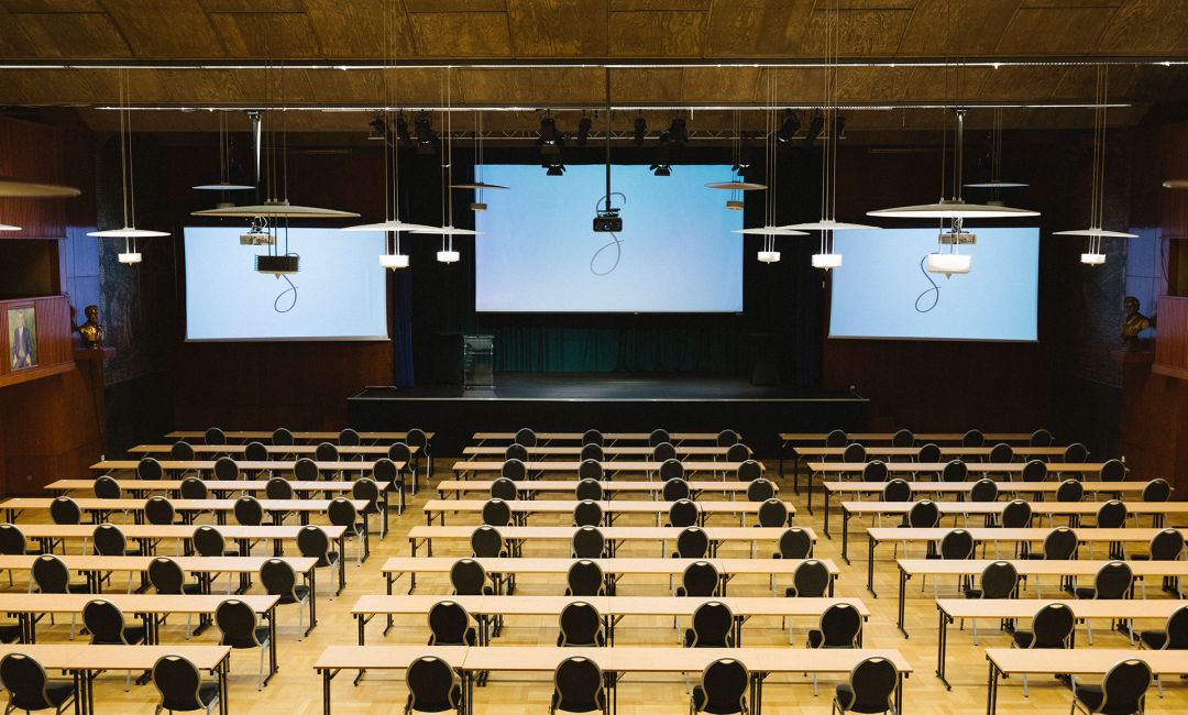 På scenen har du tre lerret tilgjengelig, hvor du har alle muligheter for oppsett: om du ønsker lik skjerm på alle tre, støttebilde på sidene eller tre forskjellige skjermer. For deres trygghet stiller vi med tekniker som er kjent med utstyret dere skal benytte. Om konferansen krever større tekniske løsninger, finner vi frem til den beste løsningen sammen med vår teknisk ansvarlig.